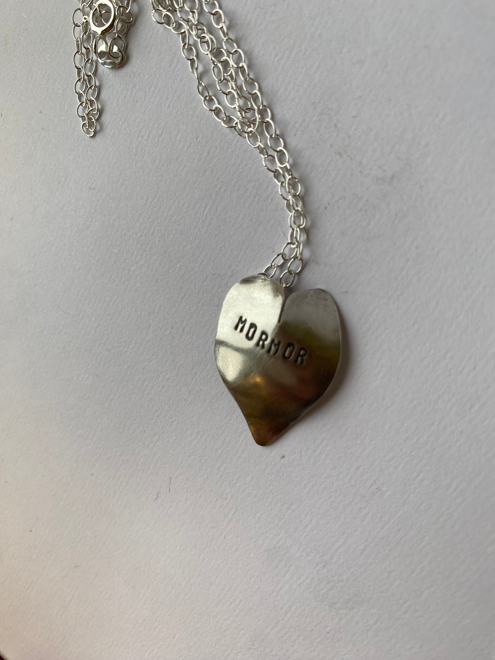 Hjerte i 925 sølv MORMOR m/kjede 45cm. Hjertene er unike, og hver enkelt blir saget ut for hånd.