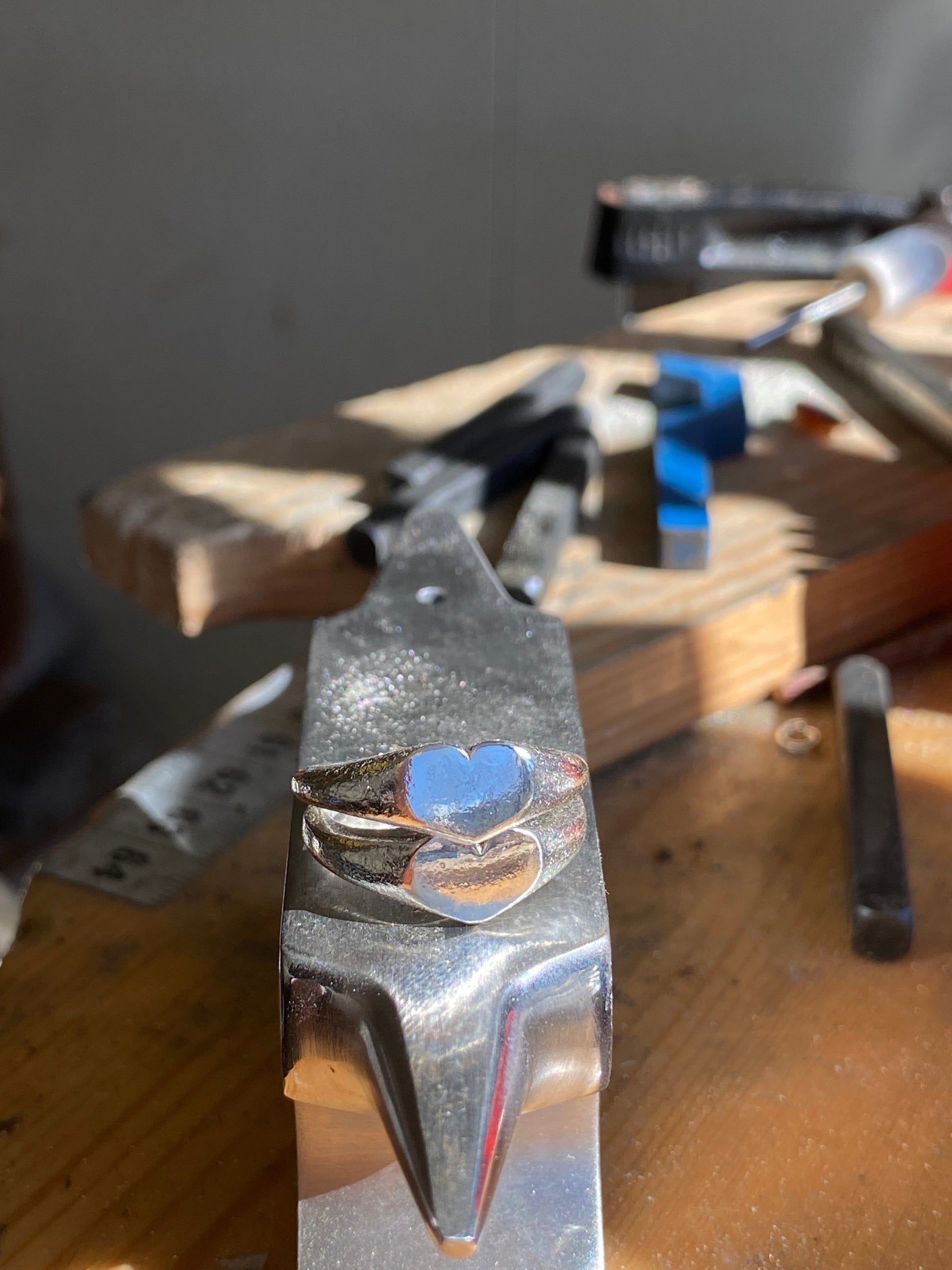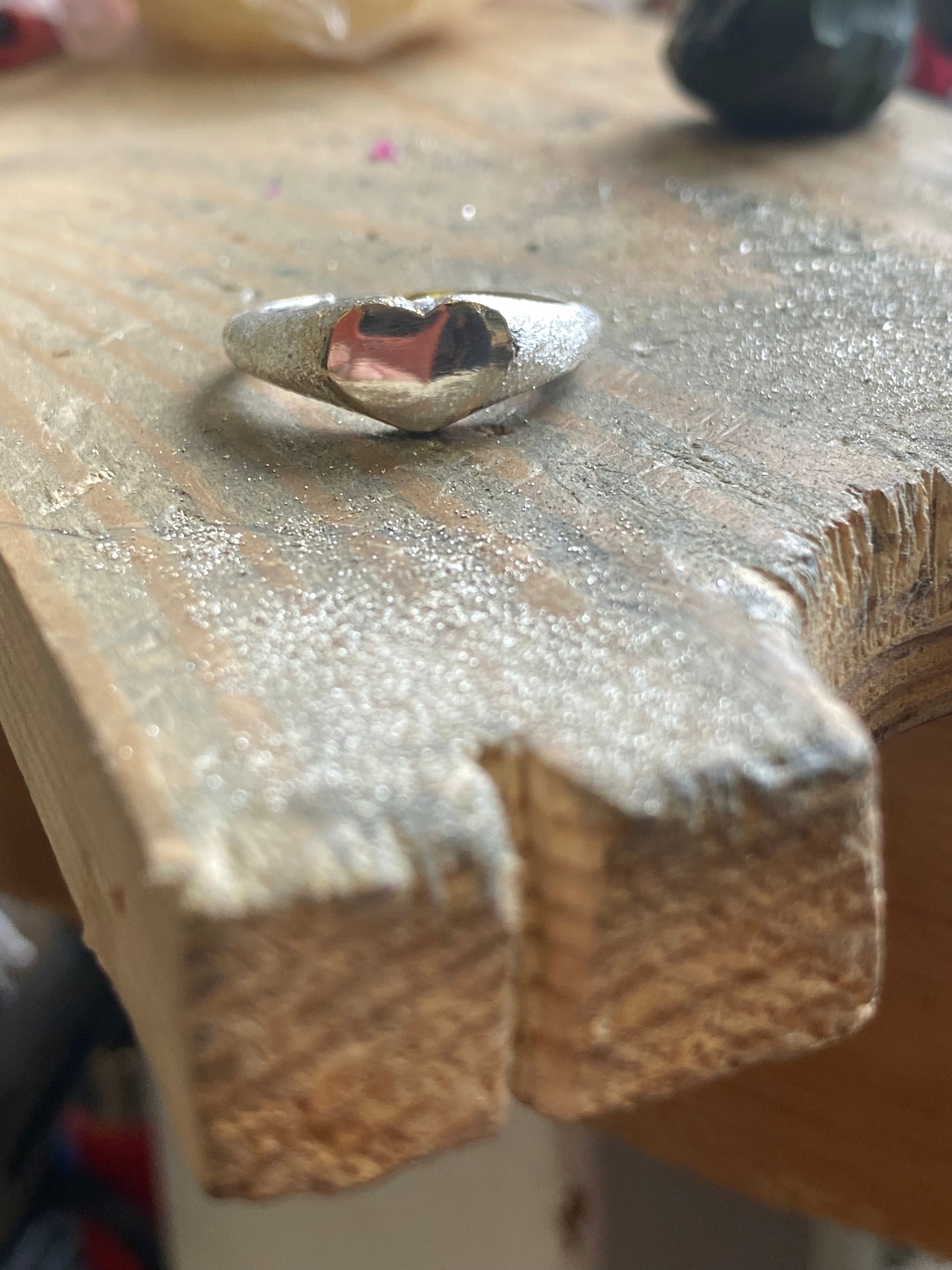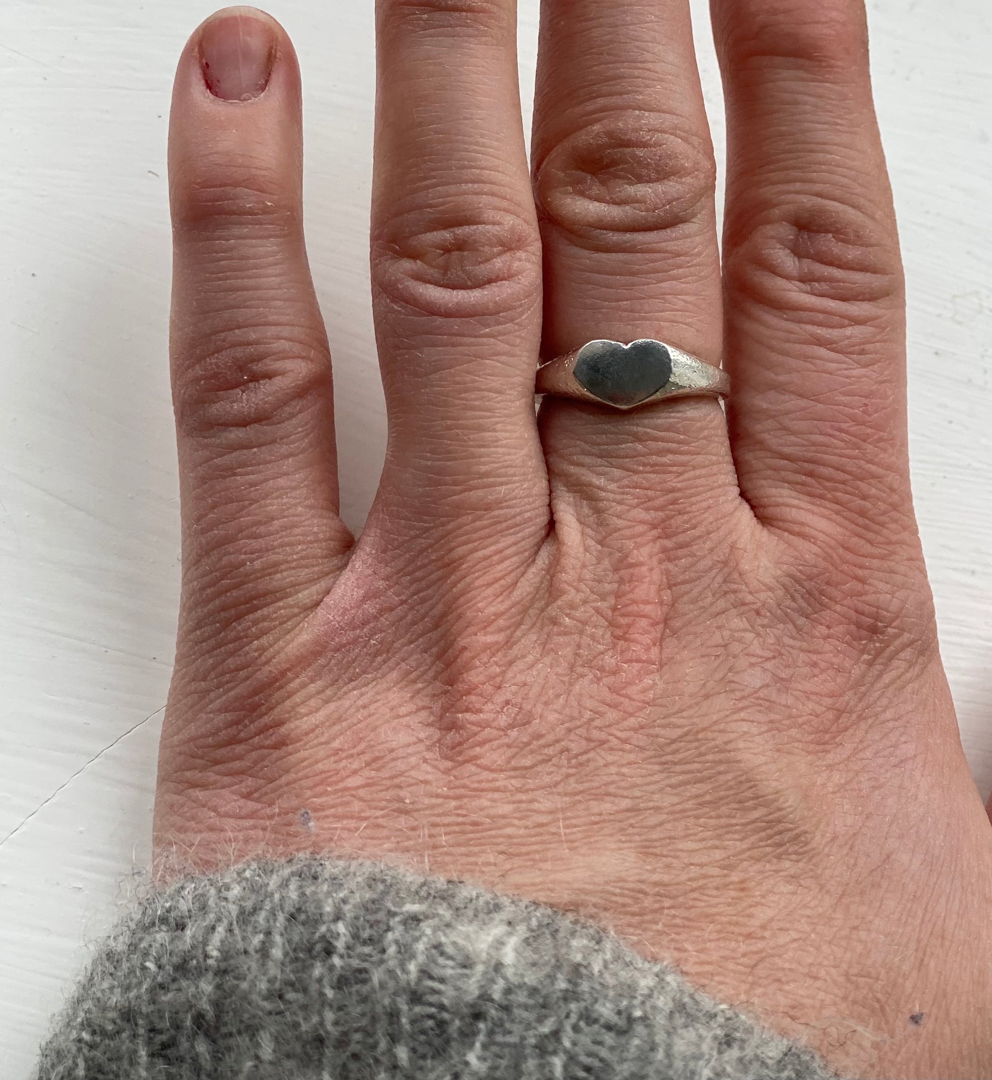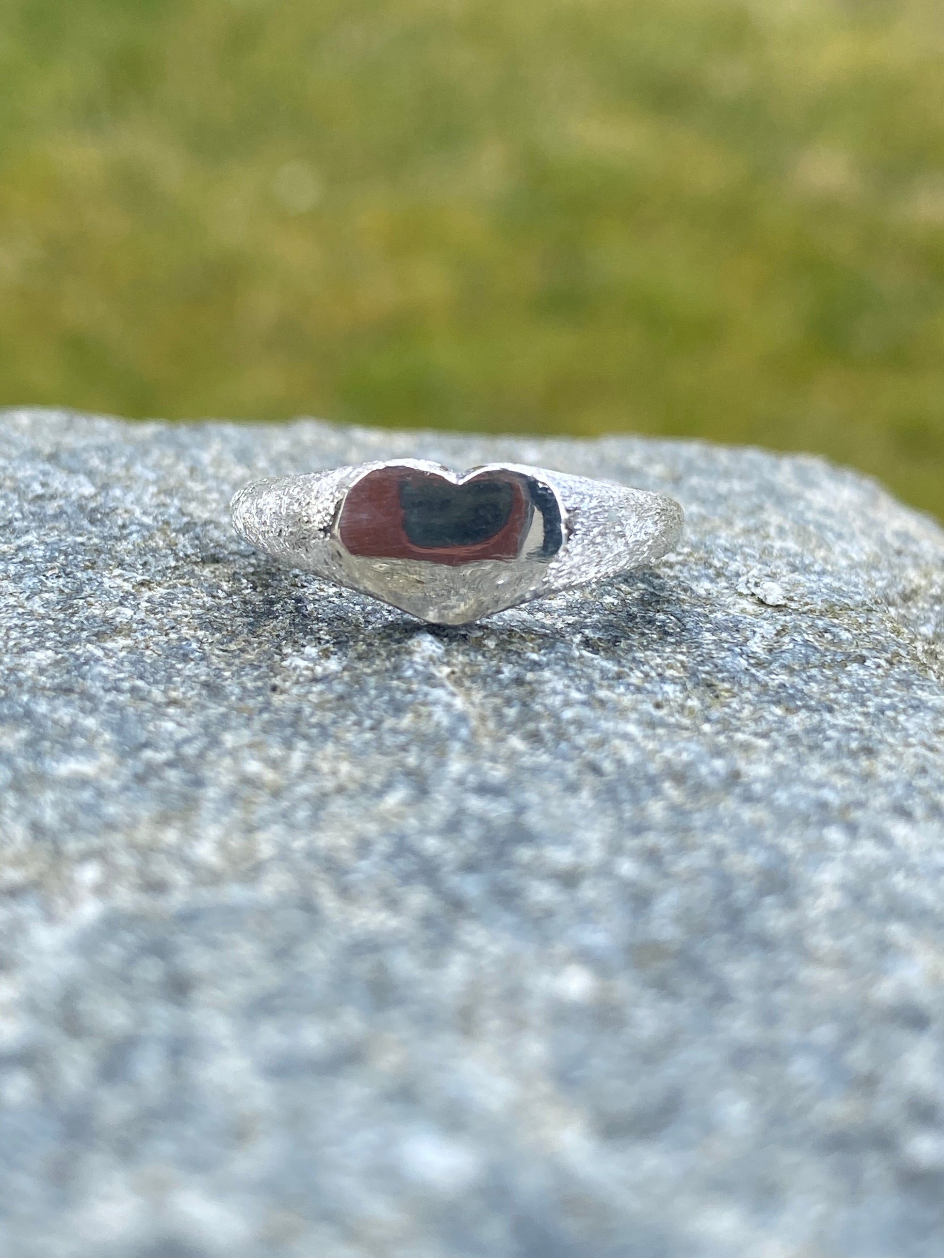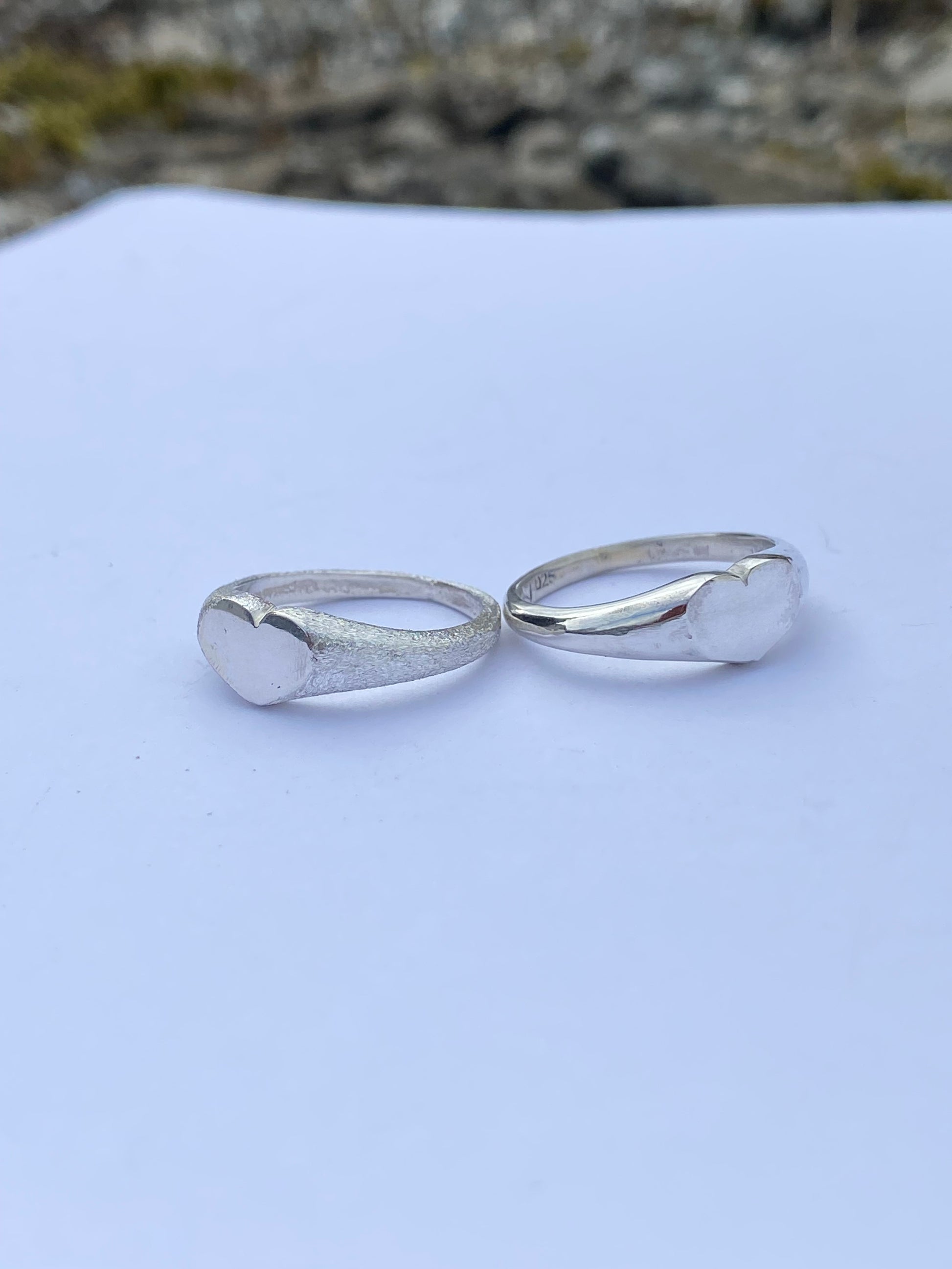 Nydelig signetring med hjerteform, mattet på sidene og blank på toppen, men hvis du ønsker kan du få den helt blank. Fin som forlovelsering og, for den som ikke ønsker en klassisk. Kan lages i gull.