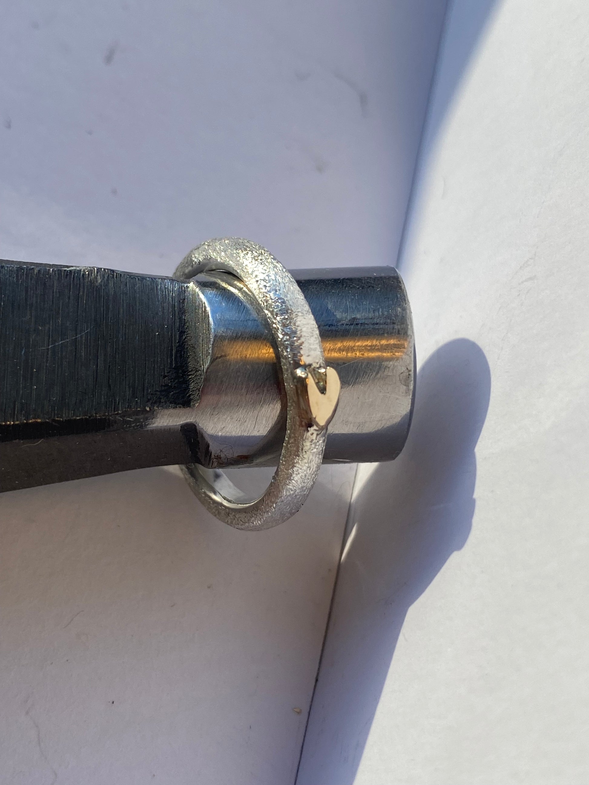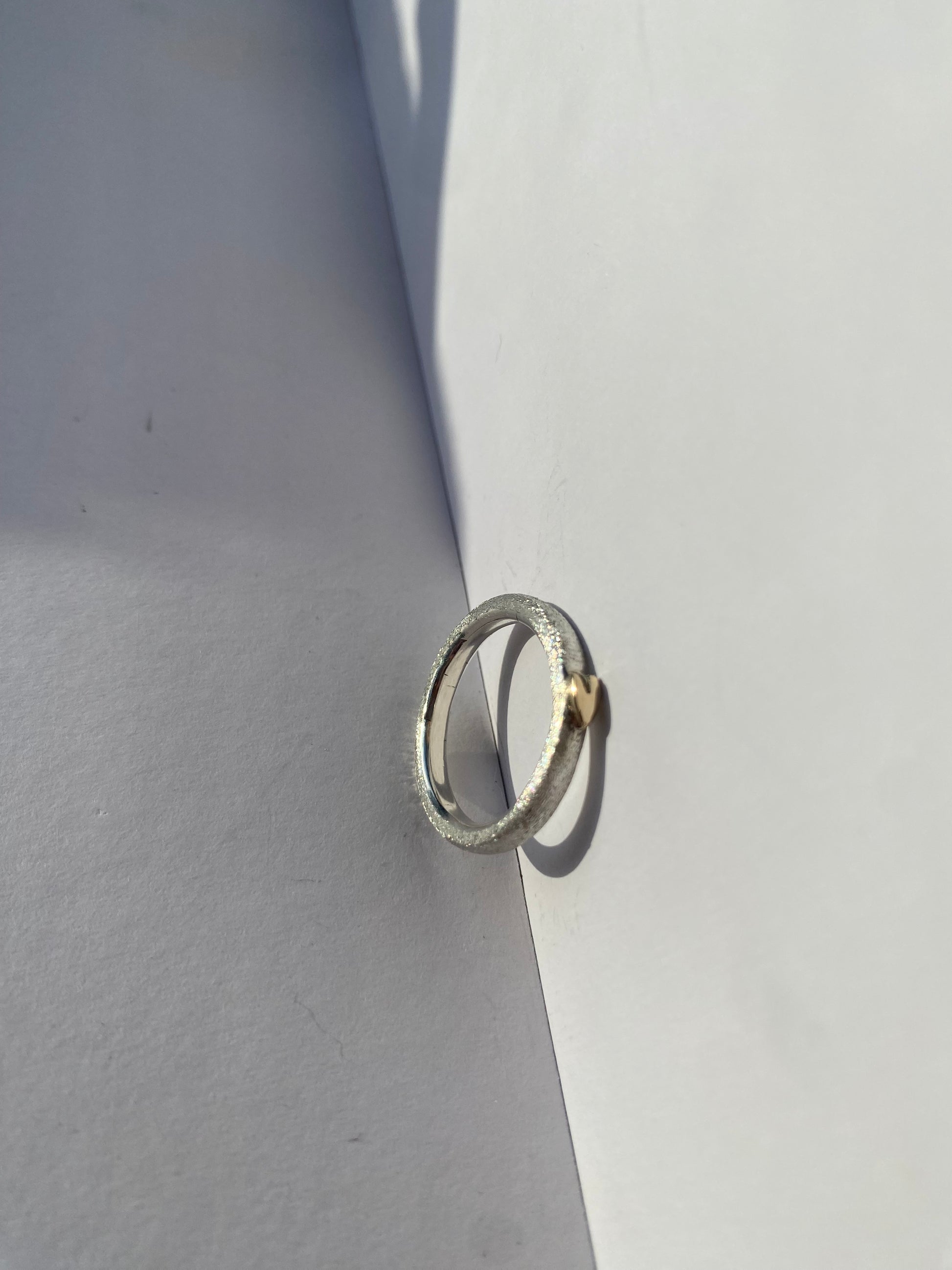 Sølvring med ekte gullhjerte, ringskinnen er børstet og hjertet er blankt. Har en igjen i str 57, men kan lages på bestilling